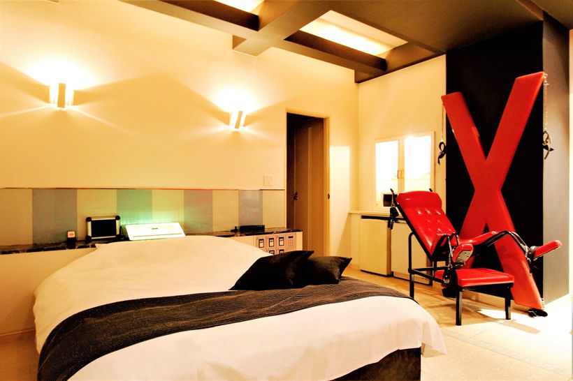 203にセンシャルチェア、205にX字枷&センシャルチェア、403にX字枷のSM什器が設置されたSMルームがあるラブホ。